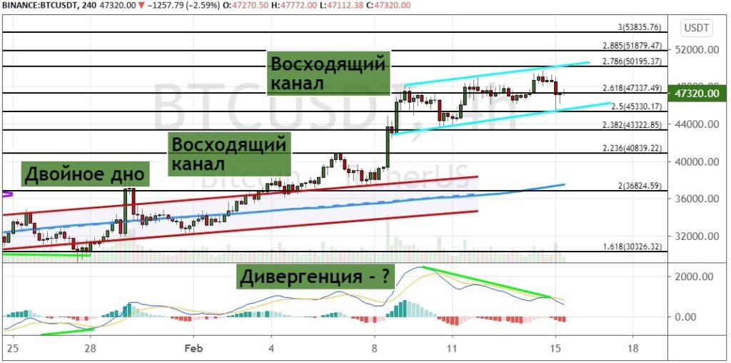 Но есть вероятность развития и нисходящей динамики. Этот сценарий будет реализован, если стоимость биткоина опустится ниже уровня поддержки 43 320, в случае чего котировки BTC отправятся к ключевой области поддержки $40 000 – $40 840. Более глубокое снижение приведет к тестированию отметки $36 824, где также проходит 200-дневная простая скользящая средняя (SMA). В пользу этого сценария говорит формирование медвежьей дивергенции между ценой на графике и осцилляторе MACD.
