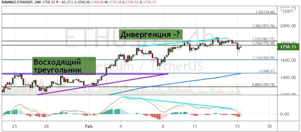 В то же время в пользу непродолжительной коррекции указывает формирование дивергенции между ценой на графике и осцилляторе MACD. В случае снижения первой поддержкой для котировок ETH выступит уровень $1 600 (11.4% расширение по уровням пропорции Фибоначчи). Развитие дальнейшей нисходящей динамики позволит активу протестировать поддержку на области $1 400 – $1 450, где также проходит линия 200-дневной SMA.