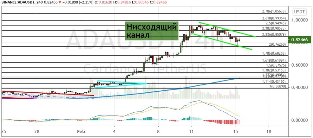 Сейчас ADA развивает движение в границах модели теханализа «Нисходящий канал». В случае развития растущей динамики котировки ADA попытаются преодолеть сопротивления на уровнях $0.85 и $0.90. Целями для роста выступает отметка $0.95, а также уровни $1, $1.05 и $1.10. Сохранение мощного импульса на рост позволит активу устремиться к среднесрочной цели на $1.13.