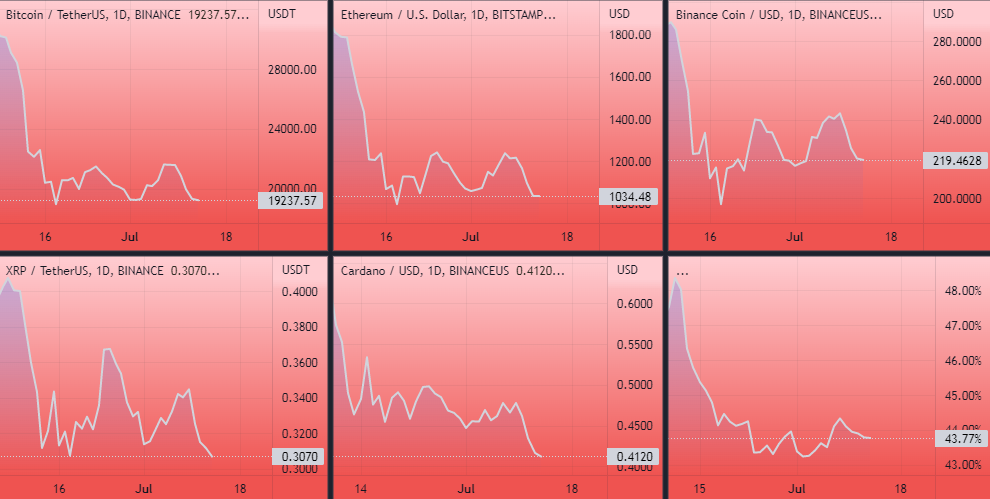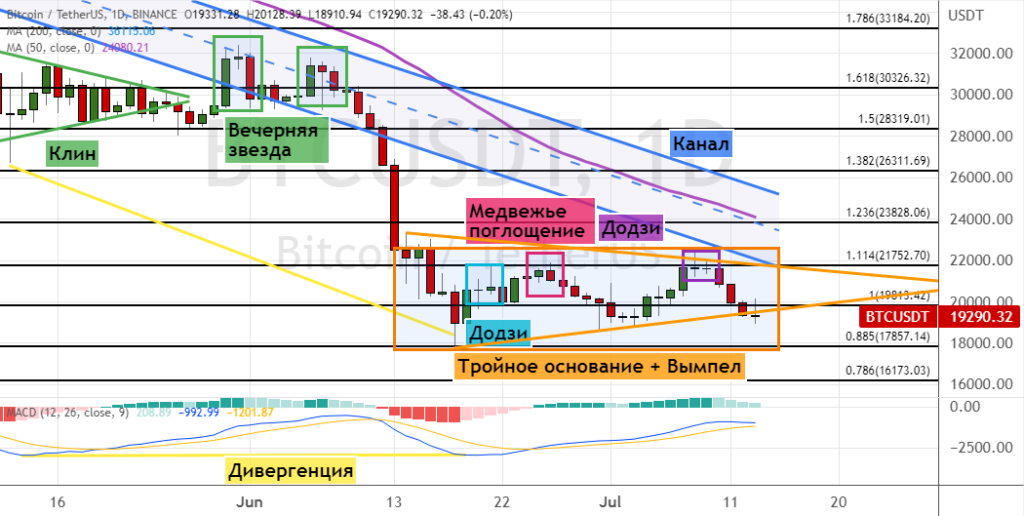 В начале недели котировки BTC продолжили опускаться, что привело к снижению до уровня $20 000 и далее — в район $19 000, где и проходят текущие торги.