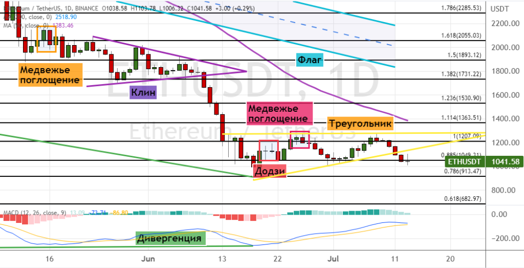 Уход котировок ниже $1 040 приведет к развитию снижения. В рамках нисходящего тренда стоимость эфира снизится до первых целей $1 000, $920 и $800. Более глубокая коррекция приведет к достижению уровня $680. В пользу реализации этого прогноза указывает закрытие дневных свечей ниже границ модели «Треугольник», а также сохраняющие актуальность сигналы теханализа, такие как модели «Додзи», «Голова и плечи», две модели «Медвежье поглощение» (границы обозначены оранжевым цветом) и пробитие нижних границ «Флага» и «Клина».