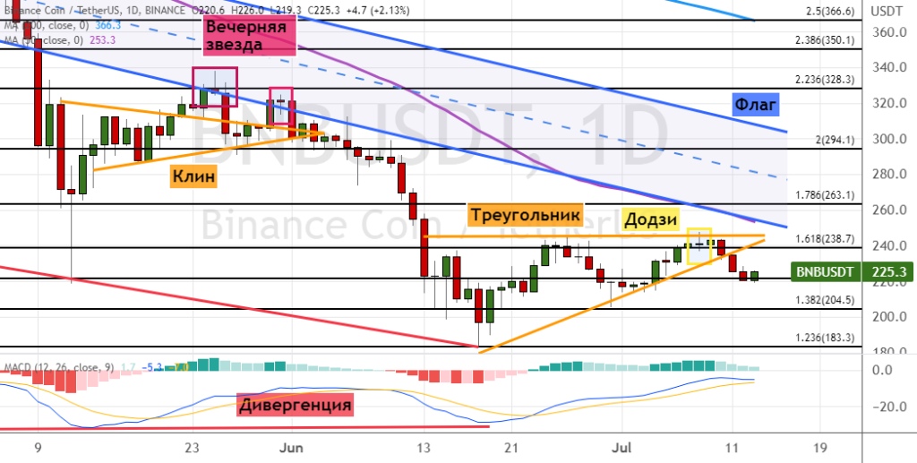 Сигналом в пользу развития медвежьей динамики выступит закрытие дневных свечей ниже уровня поддержки $220. Краткосрочное снижение может привести к достижению первых целей на уровнях $205 и $180. Более глубокая коррекция приведет к обвалу стоимости BNB до целей $165 и $150. В пользу сохранения медвежьего тренда указывает преодоление границ «Треугольника» и семь сигналов теханализа: модели «Повешенный», «Додзи», «Медвежье поглощение» и две модели «Вечерняя звезда», а также пробитие границ «Флага» (обозначен синим цветом) и «Клина» (обозначен оранжевым цветом).