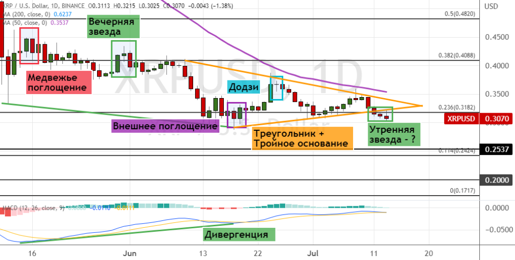 Сигналом о развитии бычьей динамики станет рост стоимости альткоина выше уровня $0.35, где также проходит линия 50-дневной SMA. Сохранение краткосрочного тренда приведет к достижению альткоином уровней $0.38 и $0.41. В случае сохранения тренда на повышение котировки XRP направятся к уровням $0.45, $0.48 и $0.55. В пользу развития восходящей динамики указывают пять сигналов: возможное формирование модели «Утренняя звезда» и модели теханализа «Треугольник», «Тройное основание», «Внешнее поглощение», а также бычья дивергенции между ценой на графике и осцилляторе MACD.