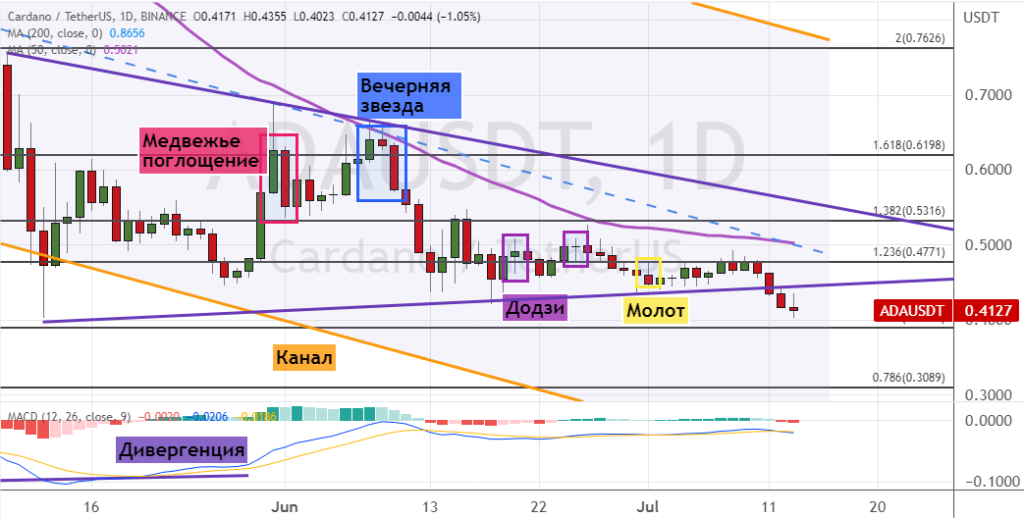 Если дневные свечи закроются ниже уровня $0.4, это станет сигналом о развитии краткосрочной медвежьей динамики. Котировки ADA тогда устремятся к первым целям в виде поддержек $0.35 и $0.31. В пользу такого развития указывают четыре сигнала: две модели теханализа «Додзи», а также модели «Медвежье поглощение» (обозначена красным цветом) и «Вечерняя звезда» (обозначена синим цветом).