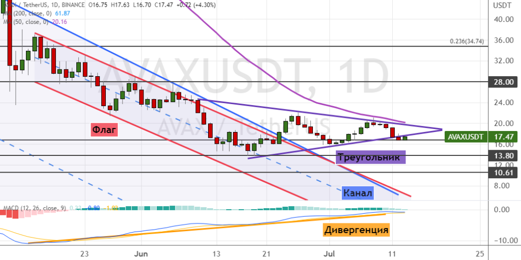 На рынке DeFi на втором месте после стейблкоина DAI держится AVAX от Avalanche. Котировки альткоина консолидируются в районе поддержки $17 и вдоль нижней границы модели «Треугольник» (на графике ниже обозначена фиолетовыми линиями).
