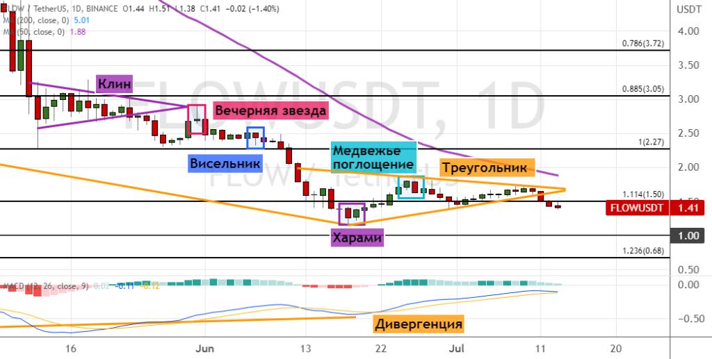 Закрытие дневных свечей ниже поддержки $1.2 приведет к достижению первой цели — $1. В пользу развития краткосрочной нисходящей динамики указывают четыре сигнала: прорыв нижней границы модели теханализа «Треугольник» и модели «Медвежье поглощение», «Вечерняя звезда» и «Молот».