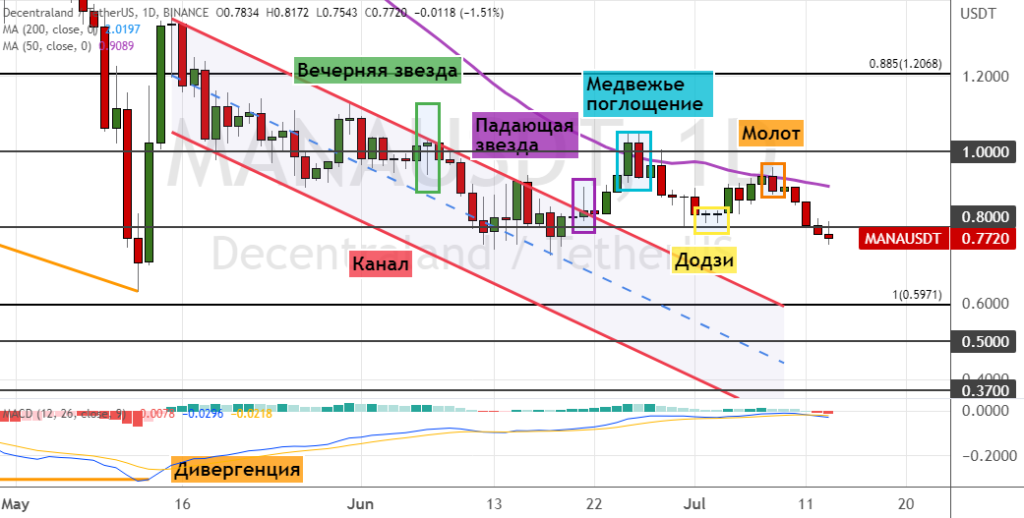 При этом закрытие дневных свечей выше уровня $0.9, где проходит линия 50-дневной SMA, приведет к восстановлению стоимости MANA до первой цели — уровня $1. Сохранение тренда приведет к достижению границ консолидации $1.2–$1.5. В пользу развития этой динамики указывают три сигнала: модель «Додзи», преодоление верхней границы «Канала» и бычья дивергенция между ценой на графике и осцилляторе MACD.
