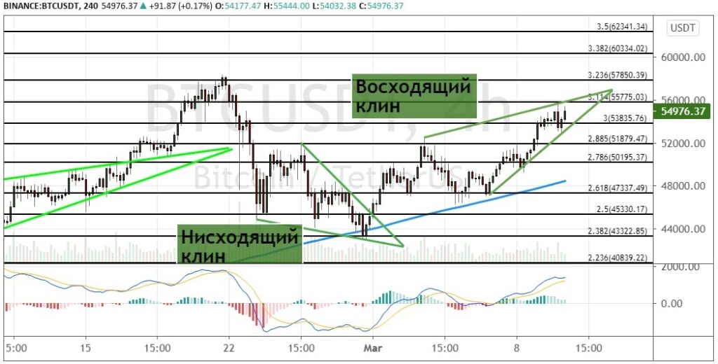 Котировки BTC смогли пробить сопротивления на уровне $50 200 и области $51 900 – $52 000, что привело к росту до целей на уровнях $53 800 и $55 800. Сохранение импульса позволит биткоину выйти вверх за рамки вероятно формирующейся фигуры теханализа «Восходящий клин». В перспективе это движение может привести к достижению уровня $57 850, рассчитанного по расширениям пропорции Фибоначчи. В среднесрочной перспективе котировки BTC будут готовы устремиться к границам области $60 000 – $60 330 и уровню $62 340.
