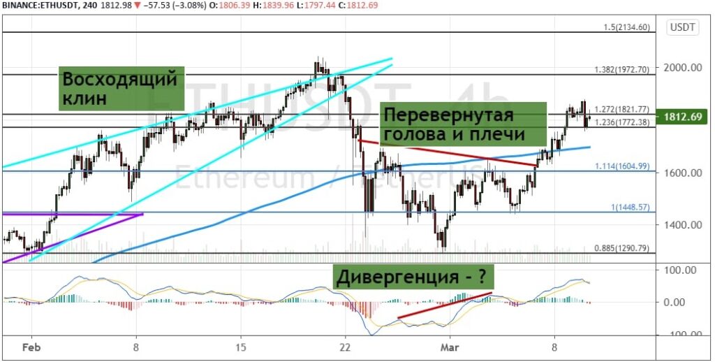 Отменой сценария с дальнейшим ростом станет уход котировок ETH ниже уровня $1 600 и границ области $1 400 – $1 450. Следующими целями в таком случае выступят поддержки на уровне $1 290 и грани области $1 150 – $1 200 и $920 – $1 000. Но этот вариант пока выглядит маловероятным.