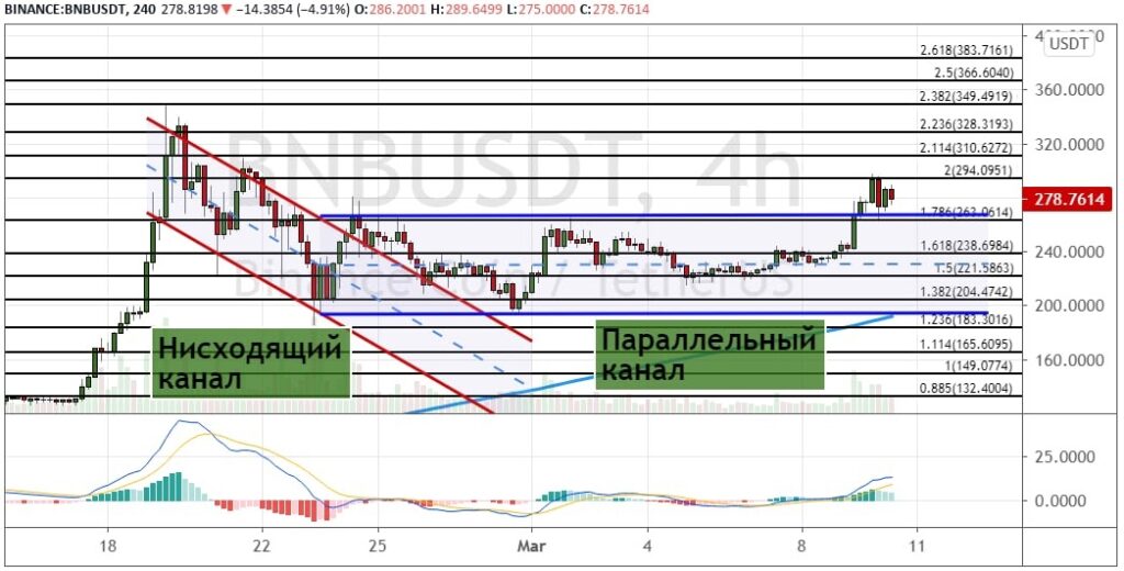 BNB закрепился выше верхней границы модели теханализа «Параллельный канал» и уровня $263. Это позволило альткоину последовательно достичь уровней $280 и $300, а их преодоление позволит котировкам BNB взлететь к $310, $328 и $350. В среднесрочной перспективе BNB готов будет устремиться к уровням $366 и $383.