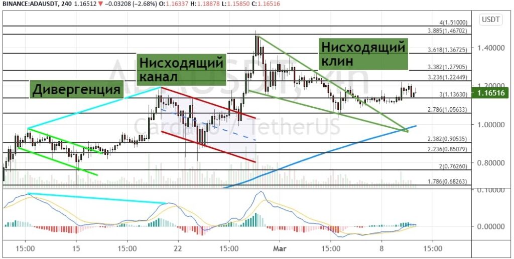 Это привело к отскоку в район $1.1360, которая теперь выступает поддержкой, а также к росту до уровня сопротивления $1.2250. Набор позиций быками может направить котировки ADA к цели в виде уровня $1.2790. В перспективе стоит ожидать движения к $1.3680, $1.4670, $1.51, $1.60 и области $1.70 – $1.74.