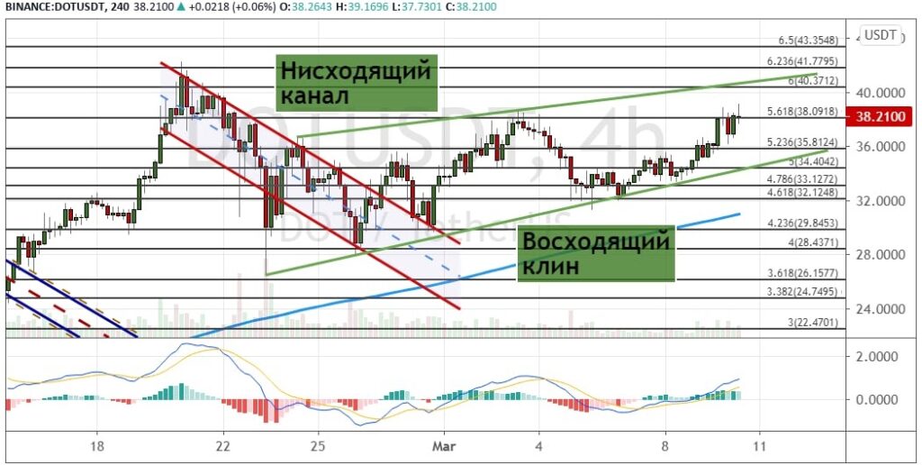 DOT развивает растущее движение внутри модели теханализа «Восходящий клин». Котировки альткоина будут готовы устремиться к 40 и $41.80 в случае прорыва текущего уровня сопротивления $38. В среднесрочной перспективе котировки DOT будут готовы обновить максимум в районе $43.40, рассчитанному на основе линий пропорции Фибоначчи.