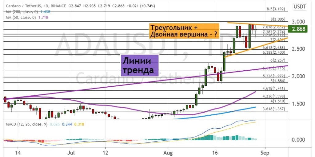 Котировки ADA развивают консолидацию, которая, так же как и в случае с ETH, приобретает вид модели теханализа «Треугольник» (показана оранжевыми линиями на графике ниже).