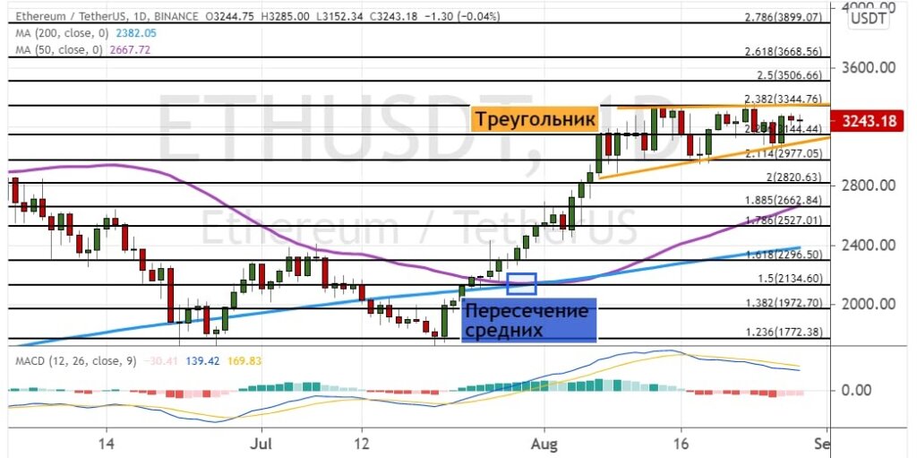 Котировки эфира продолжают двигаться внутри границ консолидации уровней $3 150–$3 350. Данное движение приобрело вид модели теханализа «Треугольник» (показан на графике ниже оранжевыми линиями).