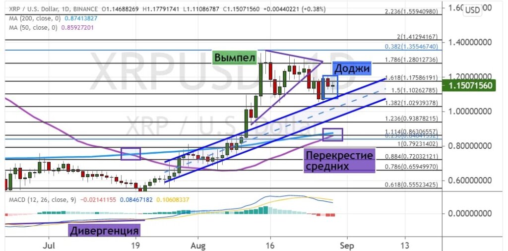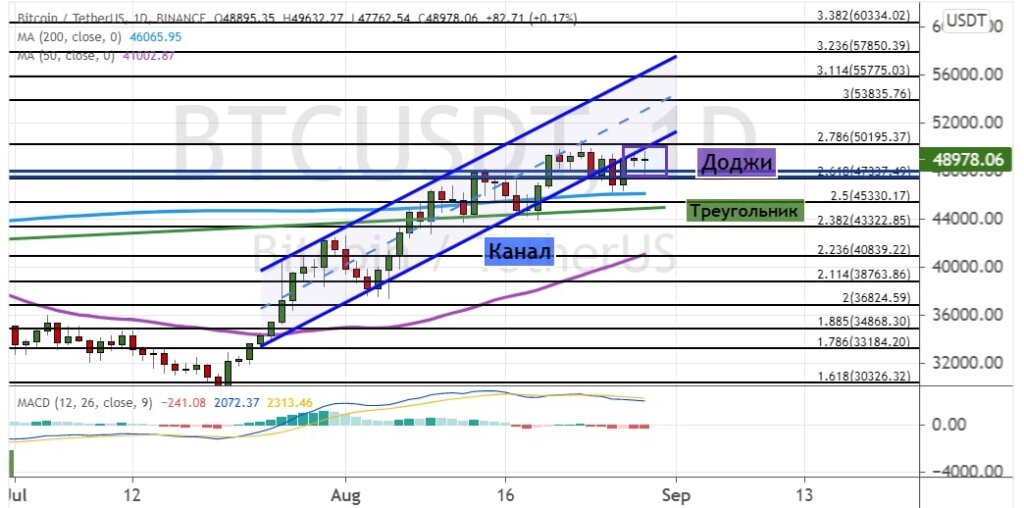На графике ниже можно отметить, что биткоин после пробития нижней границы модели теханализа «Восходящий канал» так и не смог развить мощное движение вверх. Об этом также говорит формирование свечных комбинаций «Доджи».