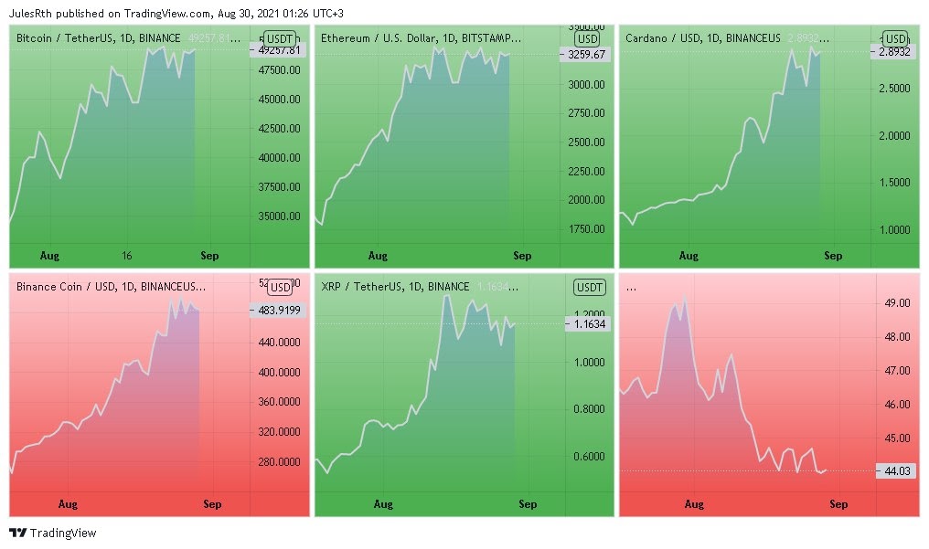 Динамика котировок BTC, ETH, ADA, BNB, XRP (дневной таймфрейм) и график доминации биткоина. Источник
