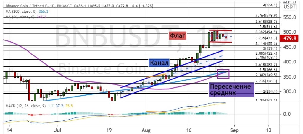 В среднесрочной перспективе стоит ожидать, что котировки BNB смогут преодолеть верхнюю границу модели теханализа «Флаг» (показана бордовыми линиями на графике ниже) и продолжить движение вверх к целям $530, $550 и $580. Однако быкам придется повременить с реализацией этой торговой идеи, в случае если альткоин опустится ниже уровней поддержек $475 и $455. Целями для продавцов в таком случае выступят уровни $440, $420 и $400.
