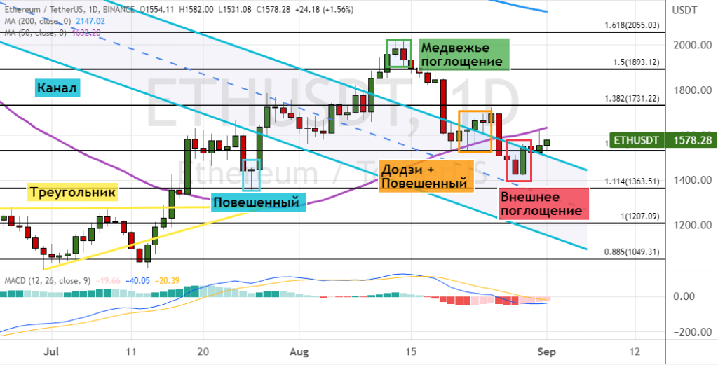 Сигналом о восстановлении медвежьей динамики послужит падение стоимости актива ниже текущего уровня поддержки. В таком случае в рамках краткосрочной нисходящей динамики котировки опустятся к первым целям $1 363 и $1 300. Более глубокая коррекция направит ETH к уровню $1 200. В пользу развития этого сценария торгов указывают модели «Повешенный» и «Додзи» (отмечены оранжевым цветом) и модель «Медвежье поглощение».