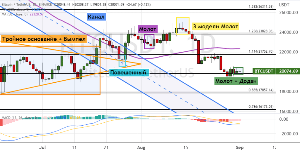 Но если быкам удастся взять уровень сопротивления $21 000 и уровень $21 800, выше которого также проходит линия 50-дневной простой скользящей средней (SMA), то это будет сигналом о формировании краткосрочного восходящего тренда. В этом случае стоимость биткоина поднимется до уровней сопротивления $23 800, $25 000 и $26 300. В пользу восстановления краткосрочного восходящего тренда указывает пять сигналов теханализа: модели «Молот», «Тройное основание», «Повешенный» (обозначена бирюзовым цветом), а также прорыв верхних границ моделей «Вымпел» и «Нисходящий канал».