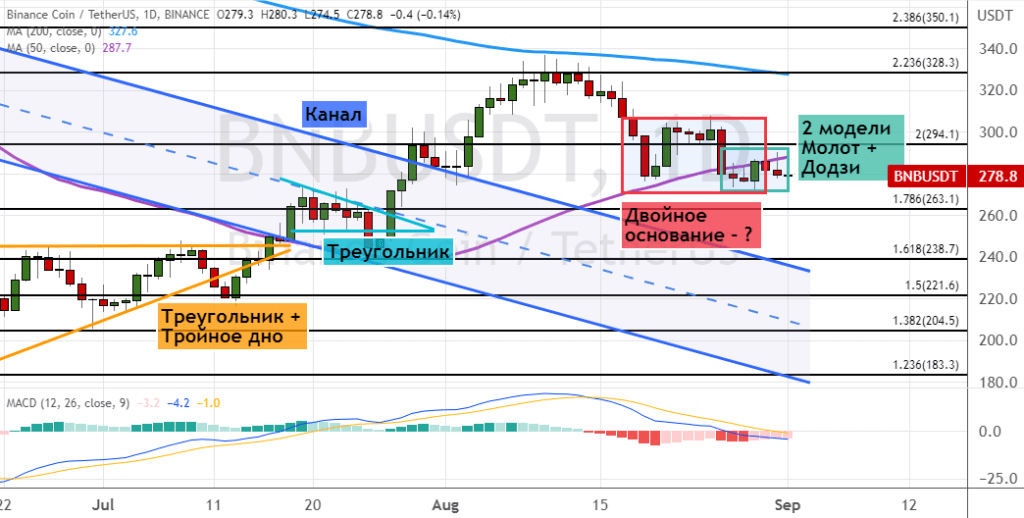 Закрытие дневных свечей выше уровня $295, где проходит линия 50-дневной SMA, и уровня $300 приведет к восстановлению бычьей динамики. Она направит котировки BNB к первым целям — границам кластера $320–$330, где также проходит линия 200-дневной SMA, и уровню $340. Сохранение восходящего тренда позволит стоимости BNB продолжить рост до уровней $350 и $366. В пользу реализации этого прогноза указывают сигналы в виде пробития верхней границы «Нисходящего канала» (обозначена синим цветом) и границ двух моделей «Треугольник», а также вероятное формирование двух моделей теханализа «Молот» и модели «Додзи» (обозначены темно-бирюзовым цветом) и «Двойное основание».