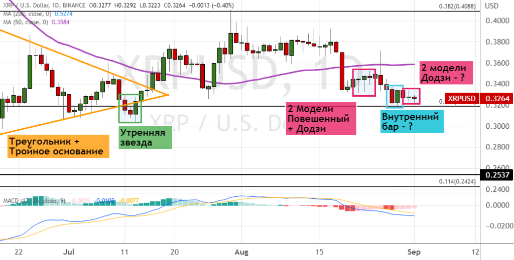 Но если дневные свечи закроются ниже поддержки $0.32, это станет сигналом о развитии краткосрочной медвежьей динамики. В таком случае XRP устремится к целям $0.3 и $0.28. Более глубокая коррекция приведет к падению котировок до границ кластера $0.24–$0.25. В пользу реализации этого прогноза указывает сигнал теханализа в виде возможного формирования двух моделей «Повешенный» и модели «Додзи» (обозначены розовыми линиями) и еще двух моделей «Додзи» (обозначены темно-розовым цветом).