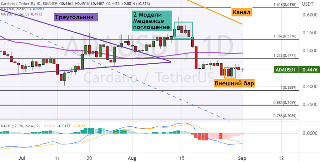 Однако если быкам удастся закрепиться выше текущего уровня сопротивления $0.48, то краткосрочный восходящий тренд позволит ADA достичь первой цели на уровне $0.5, где также проходит линия 50-дневной SMA. Дальше альткоин направится к границам консолидации $0.53–$0.55, выше которых также проходит верхняя граница модели теханализа «Нисходящий канал» (обозначена оранжевыми линиями). Сохранение восходящего тренда в среднесрочной перспективе приведет к росту ADA до уровней сопротивления $0.60 и $0.62. В районе последнего также проходит линия 200-дневной SMA. В пользу реализации этого прогноза указывает модель «Внешний бар» (отмечена фиолетовым цветом на графике) и преодоление верхней границы «Треугольника».