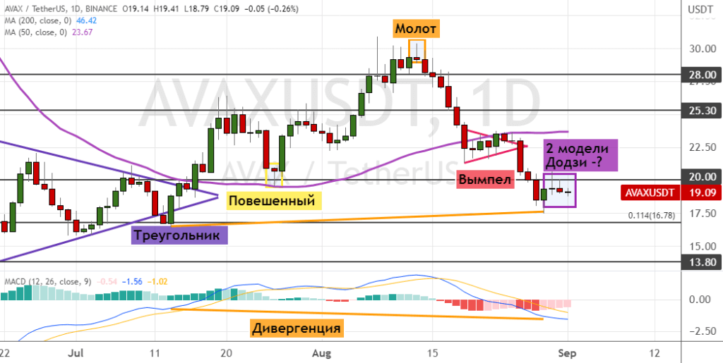 Однако если котировкам AVAX удастся закрепиться выше уровней $23 и $24, где также расположена линия 50-дневной SMA, это станет сигналом о восстановлении краткосрочной восходящей динамики. В таком случае бычий тренд позволит активу подняться до первых целей — $32 и $34.80. В пользу развития этого сценария торгов указывают три сохраняющие актуальность сигнала теханализа: «Повешенный» (желтый цвет), преодоление верхней границы модели «Треугольник», а также бычья дивергенция между ценой на графике и осцилляторе MACD.