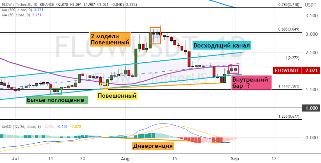 Но в случае падения котировок FLOW ниже границ консолидации $1.7–$2, в районе которых также проходит линия 50-дневной SMA и медиана модели «Нисходящий канал», медвежья динамика направит альткоин к линии поддержки на уровне $1.6. Более глубокая коррекция приведет к снижению стоимости FLOW до границ консолидации $1.2–$1.5. В пользу развития краткосрочной нисходящей динамики указывают две модели теханализа «Повешенный» (обозначены оранжевым цветом). Также в пользу снижения может указывать вероятно формирующаяся модель «Внутренний бар» (обозначена темно-розовым цветом).