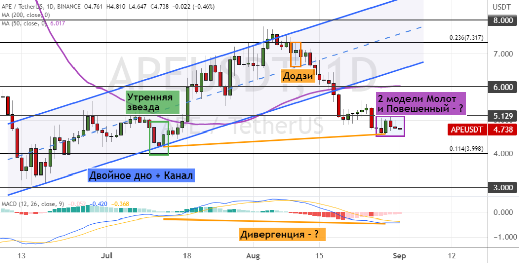 При этом сигналом о восстановлении бычьей динамики станет рост котировок APE выше уровня $6, где также проходит линия 50-дневной SMA, и уровня $7.3. Чуть ниже $7.3 также проходит нижняя граница «Восходящего канала» (обозначена синим цветом). В среднесрочной перспективе быки будут готовы протестировать уровни $8 и $9.2. В пользу реализации этого прогноза указывают три сигнала теханализа в виде моделей «Двойное дно» и «Утренняя звезда», а также вероятно формирующаяся бычья дивергенция между ценой на графике и осцилляторе MACD.