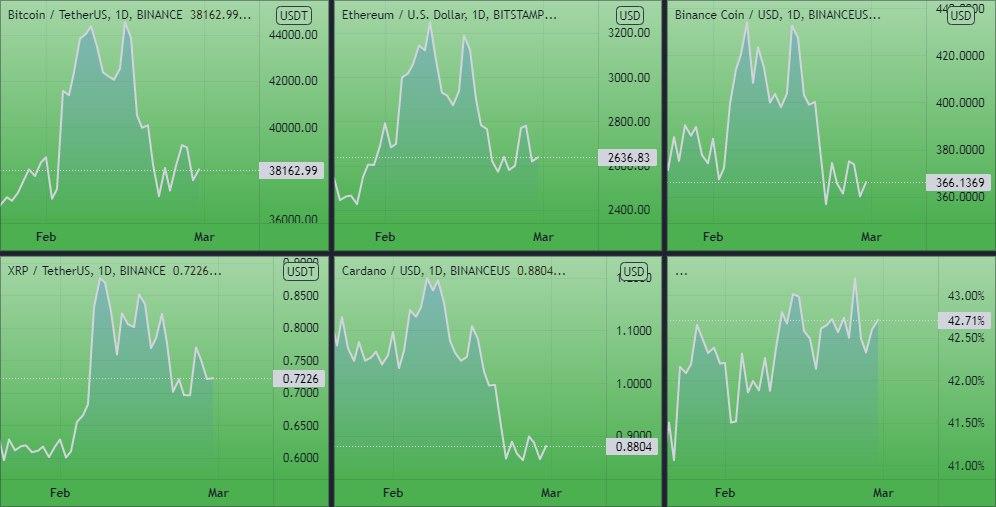 Динамика котировок BTC, ETH, ADA, BNB, XRP (дневной таймфрейм) и график доминации биткоина. Источник