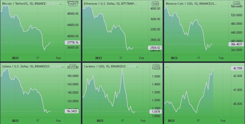 Динамика котировок BTC, ETH, ADA, BNB, XRP (дневной таймфрейм) и график доминации биткоина. Источник