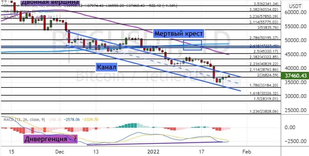 Однако на графике биткоина также может появиться медвежий сигнал в виде модели теханализа «Мертвый крест» — возможного пересечения 50-дневной SMA и 200-дневной SMA. В этом случае котировки BTC устремятся к уровням поддержки $35 000 и $33 200, где проходит нижняя граница модели «Нисходящий канал». Также сохраняется вероятность того, что нисходящая коррекция еще пока не закончена и согласно волновой теории Эллиотта может начаться 5-я волна снижения активов крипторынка.