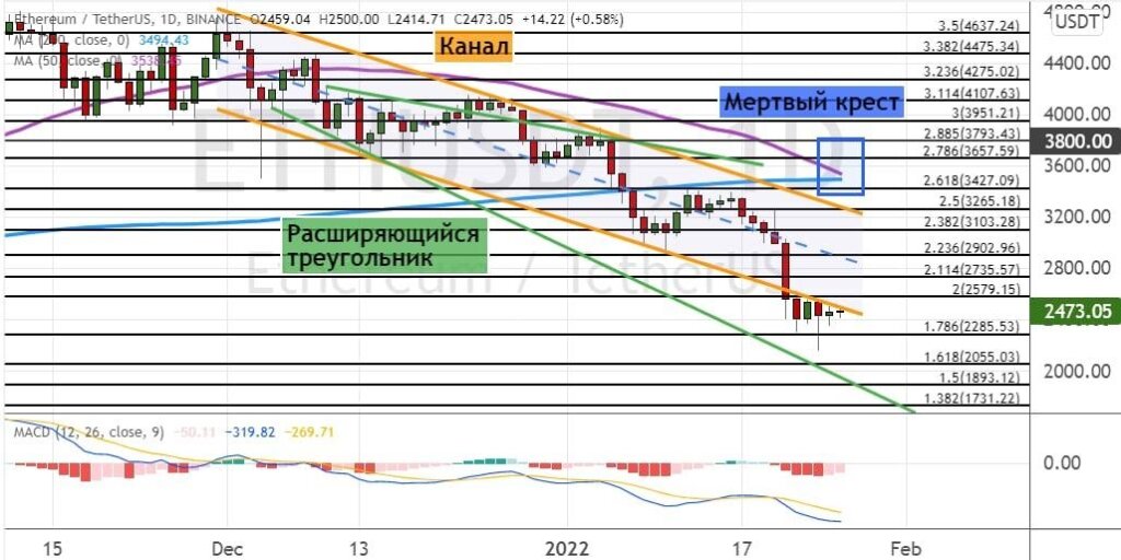 Но на графике ETH, так же как и на графике BTC, формируется модель теханализа «Мертвый крест», что указывает на сохранение сильных позиций медведей. Подтвердит этот прогноз обвал стоимости эфира ниже уровней $2 400 и $2 280. Более глубокая коррекция направит альткоин к первой цели $2 050, где проходит нижняя граница модели теханализа «Расходящийся треугольник» (обозначен на графике ниже линиями зеленого цвета). Сохранение нисходящего импульса приведет к снижению стоимости ETH до $1 900, $1 730 и $1 530.
