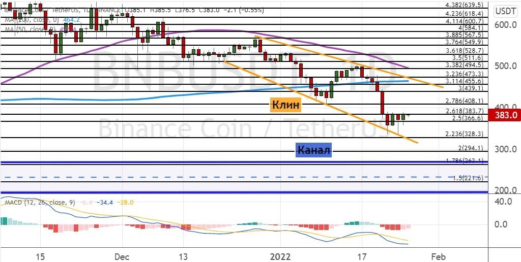 Котировки BNB продолжают двигаться вдоль нижней границы фигуры теханализа «Клин» (на графике ниже обозначена линиями оранжевого цвета). Первая цель быков расположена на уровне $410. Сохранение восходящего импульса приведет к росту стоимости BNB до уровней $440 и $450, где также проходит верхняя граница «Клина» и линия 200-дневной SMA.