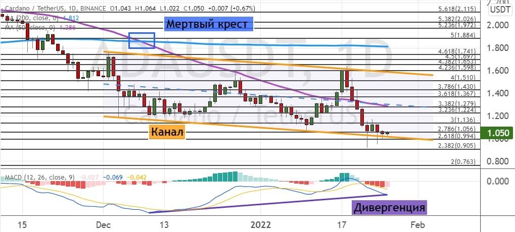 На графике ADA начала формироваться дивергенция между ценой криптовалюты и осциллятором MACD. Это может быть сигналом о росте котировок альткоина выше сопротивления $1.13. В таком случае ADA направится к границам кластера уровней $1.22–$1.28, где также расположены медиана «Нисходящего канала» и линия 50-дневная SMA. Первыми целями для быков выступают уровни $1.37, $1.43 и $1.51.