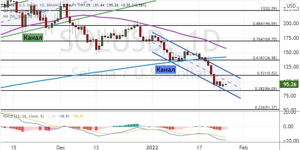 Если быкам удастся закрепиться выше сопротивления $110, то следующая цель для них будет расположена на уровне $137. Однако на этом уровне вскоре могут пересечься линии 50-дневной SMA и 200-дневной SMA и сформировать медвежью фигуру теханализа «Мертвый крест». В то же время цена альткоина находится в зоне «Перепроданности» на осцилляторе MACD, что также является сильным медвежьим сигналом. В случае начала нисходящей коррекции котировки SOL опустятся ниже $84. В таком случае медведи смогут продавить стоимость альткоина до поддержек $70 и $51.