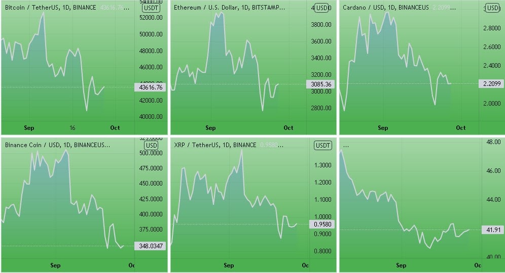 Динамика котировок BTC, ETH, ADA, BNB, XRP (дневной таймфрейм) и график доминации биткоина. Источник.