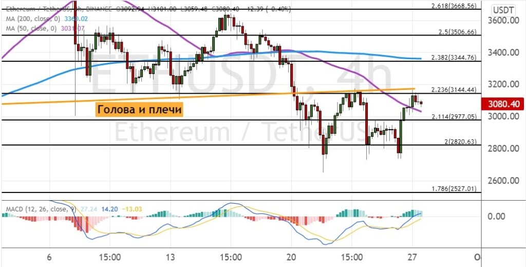 Эфир в последние дни торгуется между поддержкой $2 820, где проходит линия 50-периодной SMA, и сопротивлением $3 150. Реализация модели теханализа «Голова и плечи» (показана на графике ниже оранжевым цветом) откроет путь для падения стоимости эфира до уровней $2 650, $2 520 и $2 300.