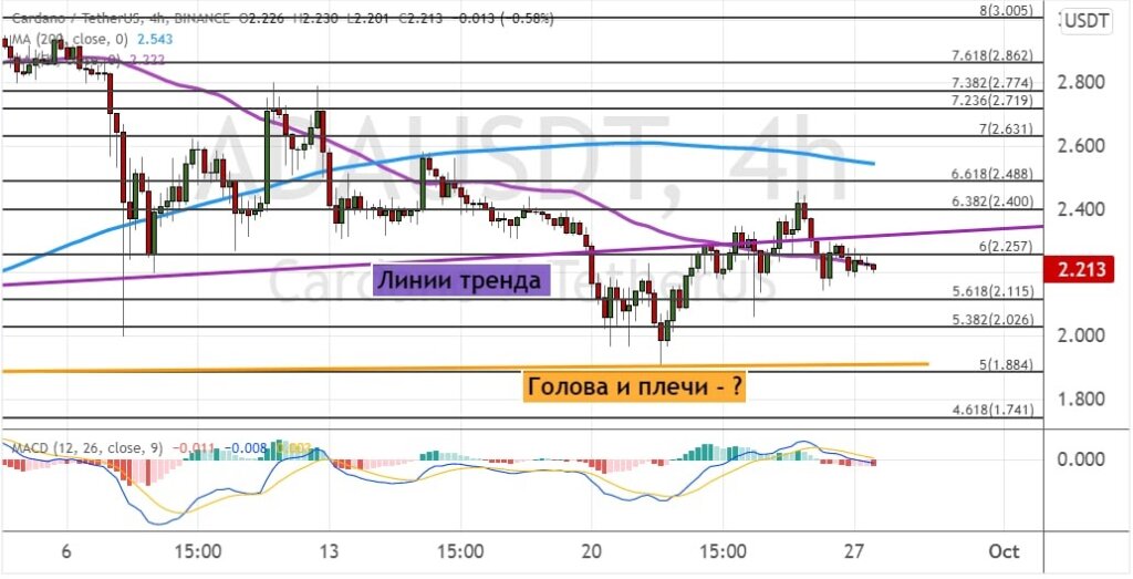 В выходные ADA так и смогла закрепиться выше важных уровней сопротивления $2.25 и $2.4, где проходят линия тренда (на графике ниже отмечена фиолетовым цветом) и линия 50-периодной SMA. Текущими поддержками выступают отметки $2.10, $2 и $1.9, где проходит граница модели теханализа «Голова и плечи» (показана оранжевым цветом). Их прорыв позволит цене альткоина устремиться в кратковременную коррекцию в район $1.75, $1.6 и $1.5.