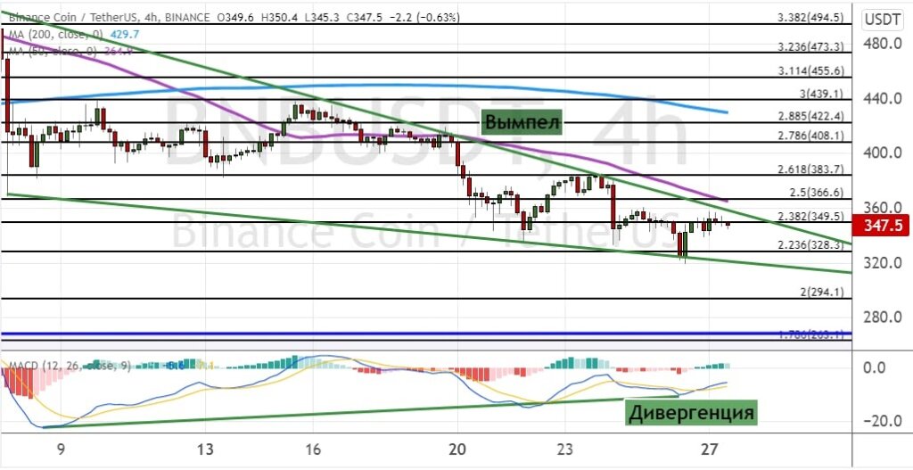 На графике ниже котировки BNB сформировали модель теханализа «Вымпел» (отмечена зеленым цветом). Падение стоимости альткоина ниже поддержки $328 позволит цене продолжать снижение к первым целям на уровнях $300 и $260, где проходит граница модели теханализа «Канал» (на графике ниже показана синим цветом).