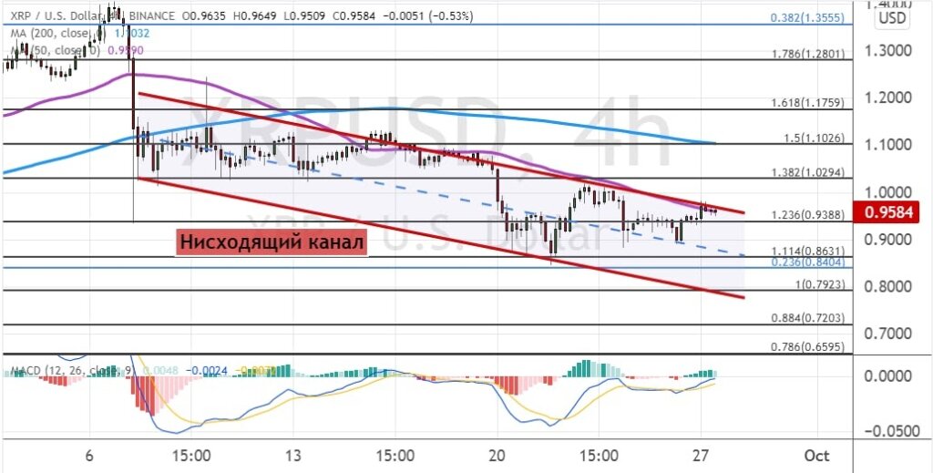 XRP продолжает движение в рамках восходящего тренда. Текущими сопротивлениями выступают уровень $1, где расположилась линия 50-периодной SMA, и верхняя граница модели теханализа «Нисходящий канал» (показана на графике ниже бордовым цветом). Первые цели для роста расположены на уровнях $1.10, где проходит линия 200-периодной SMA, и $1.20.