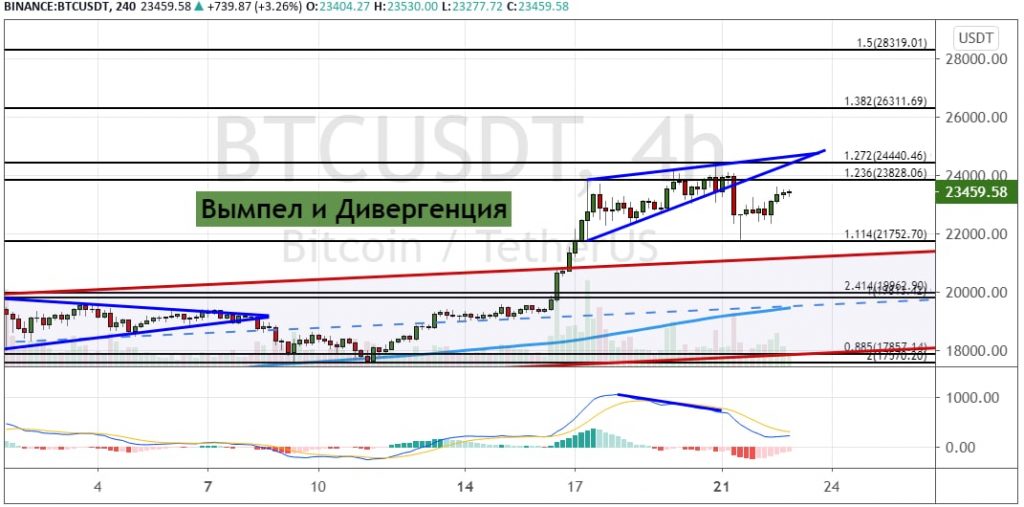 После коррекции к первой линии поддержки на уровне $21 750 (11.4% расширение по линиям пропорции Фибоначчи) биткоин показывает высокую волатильность. Сигналами о начале этого движения стала медвежья дивергенция между ценой на графике и MACD, а также пробитие нижней грани фигуры теханализа «Вымпел». Но котировки BTC там не закрепились и начали расти.