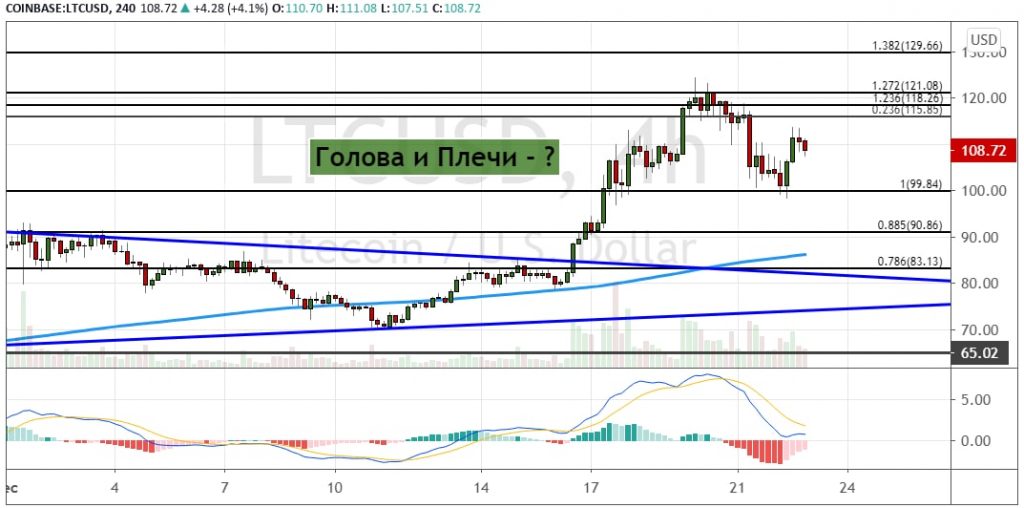 Лайткоин, так же как и биткоин, после ретеста важной поддержки $100 направился вверх к $110. Между этими двумя уровнями сейчас и происходят торги. В случае если LTC опустится ниже $100, котировки актива отправятся к уровням $90.80 (88.5% коррекция по уровням Фибоначчи), где проходит 200-дневная SMA, и далее к $83 (78.6% коррекция по уровням Фибоначчи). В пользу этого указывает завершающая формирование разворотная модель теханализа «Голова и плечи».