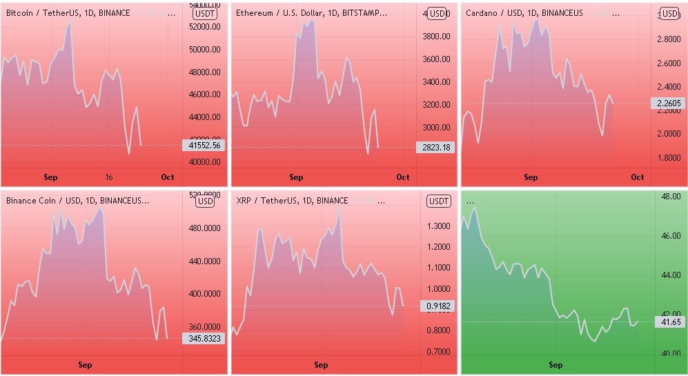 Динамика котировок BTC, ETH, ADA, BNB, XRP (дневной таймфрейм) и график доминации биткоина. Источник.