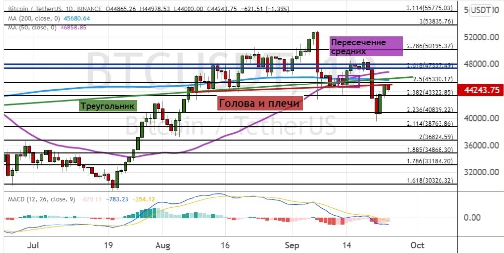 В среднесрочной перспективе биткоин сохраняет возможности для роста. Это будет подтверждено в случае подъема цены BTC выше уровня $45 300 и границ консолидации уровней $47 500–$48 000, где проходит верхняя граница модели теханализа «Треугольник» (показана на графике ниже зеленым цветом) и где пересеклись линии 50-дневной простой скользящей средней (SMA) и 200-дневной SMA.