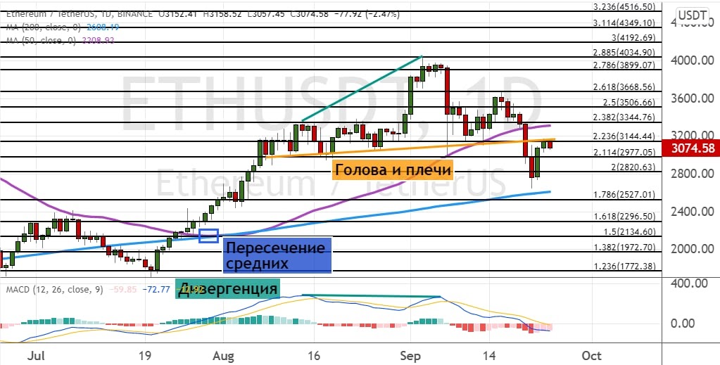 На графике эфира также можно отметить ретест линии границы модели теханализа «Голова и плечи» (показана на графике ниже оранжевым цветом) и сопротивления на $3 150. При этом развитие нисходящего движения позволило цене ETH закрепиться ниже поддержек на уровнях $3 000 и $2 950. Поэтому сейчас первой целью для медведей выступает уровень $2 820. Дальнейшее движение вниз приведет к снижению до уровней $2 650, $2 520 (где проходит линия 50-дневной SMA) и $2 300.