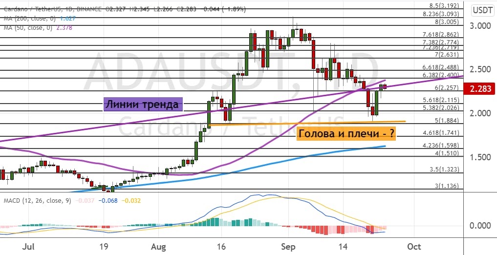 После ретеста уровней $2.25 и $2.4, где проходят линия тренда (на графике ниже отмечена фиолетовым цветом) и линия 50-дневной SMA, котировки ADA готовы устремиться вниз к первым целям на поддержках $2.10, $2 и $1.9. Их преодоление станет сигналом для реализации модели теханализа «Голова и плечи» (линия шеи показана оранжевым цветом). Развитие нисходящего тренда откроет путь для движения котировок ADA к уровням $1.75, $1.6, где проходит линия 200-дневной SMA, и $1.5.