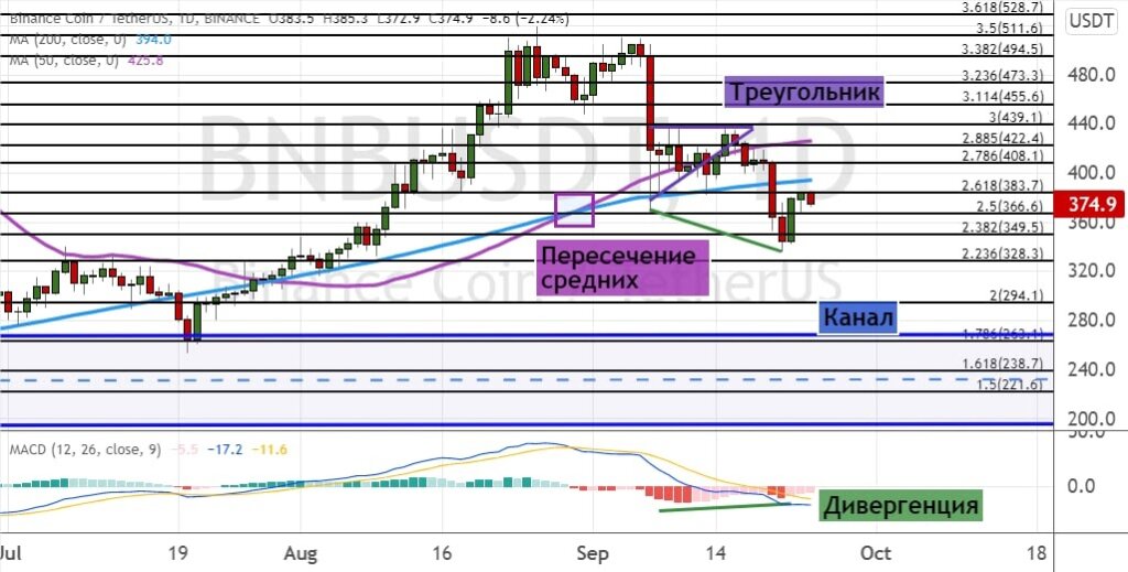 Криптовалюта продолжает снижаться в цене после прорыва границы модели теханализа «Треугольник» (линии отмечены на графике ниже фиолетовым цветом). После ретеста уровня $380, где проходит линия 200-дневной SMA, котировки BNB будут готовы пробить поддержки на уровнях $350 и $330. Сохранение нисходящего импульса отправит монету к поддержкам $300 и $260, где проходит граница «Канала» (показана синим цветом).