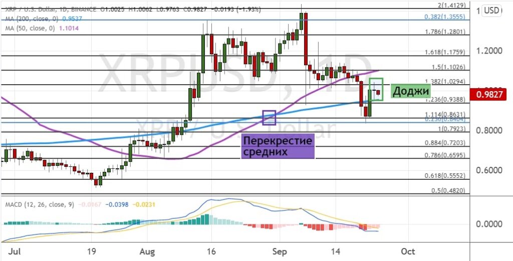 По итогам торгов во время вчерашней сессии XRP сформировал свечную комбинацию «Доджи» (показана ниже салатовым квадратом), что может указывать на формирование нового нисходящего импульса. Подтвердит эту идею закрытие дневных свечей ниже уровня $0.94, где проходит линия 200-дневной SMA, и района консолидации уровней $0.84–$0.86. В таком случае целями для медведей выступят $0.80, $0.72 и $0.65.