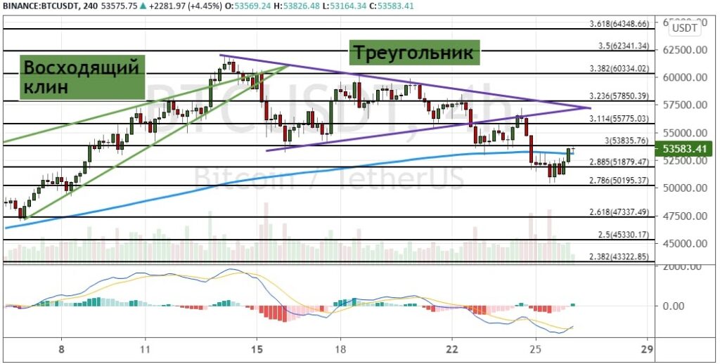 Биткоин после пробития и ретеста нижней границы модели теханализа «Треугольник», обозначенной на графике ниже, достиг первых целей в виде области $51 900 – $52 000 и уровня $50 200. Однако котировкам BTC удалось отыграть снижение и частично восстановить позиции. В результате указанные выше уровни теперь вновь выступают поддержками, а сопротивлением стал уровень $53 800, где также проходит линия 200-дневной простой скользящей средней (SMA).